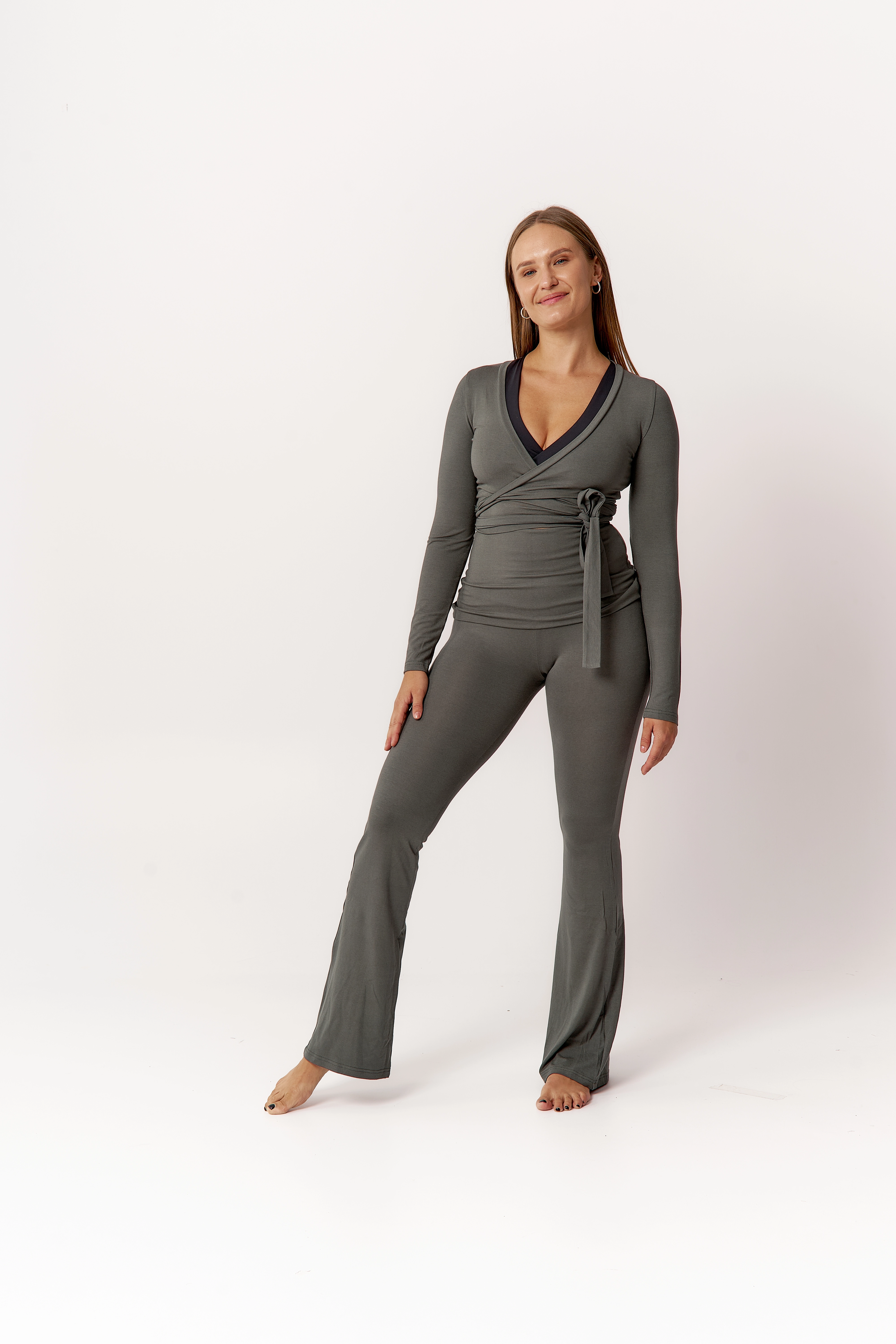 Elastyczny, lekki materiał pięknie dopasowuje się do sylwetki, a krój z rozszerzaną nogawką optycznie wydłuża nogi i wysmukla całą sylwetkę. Spodnie są idealne na pilates, stretching, jogę, ale też do noszenia na co dzień.