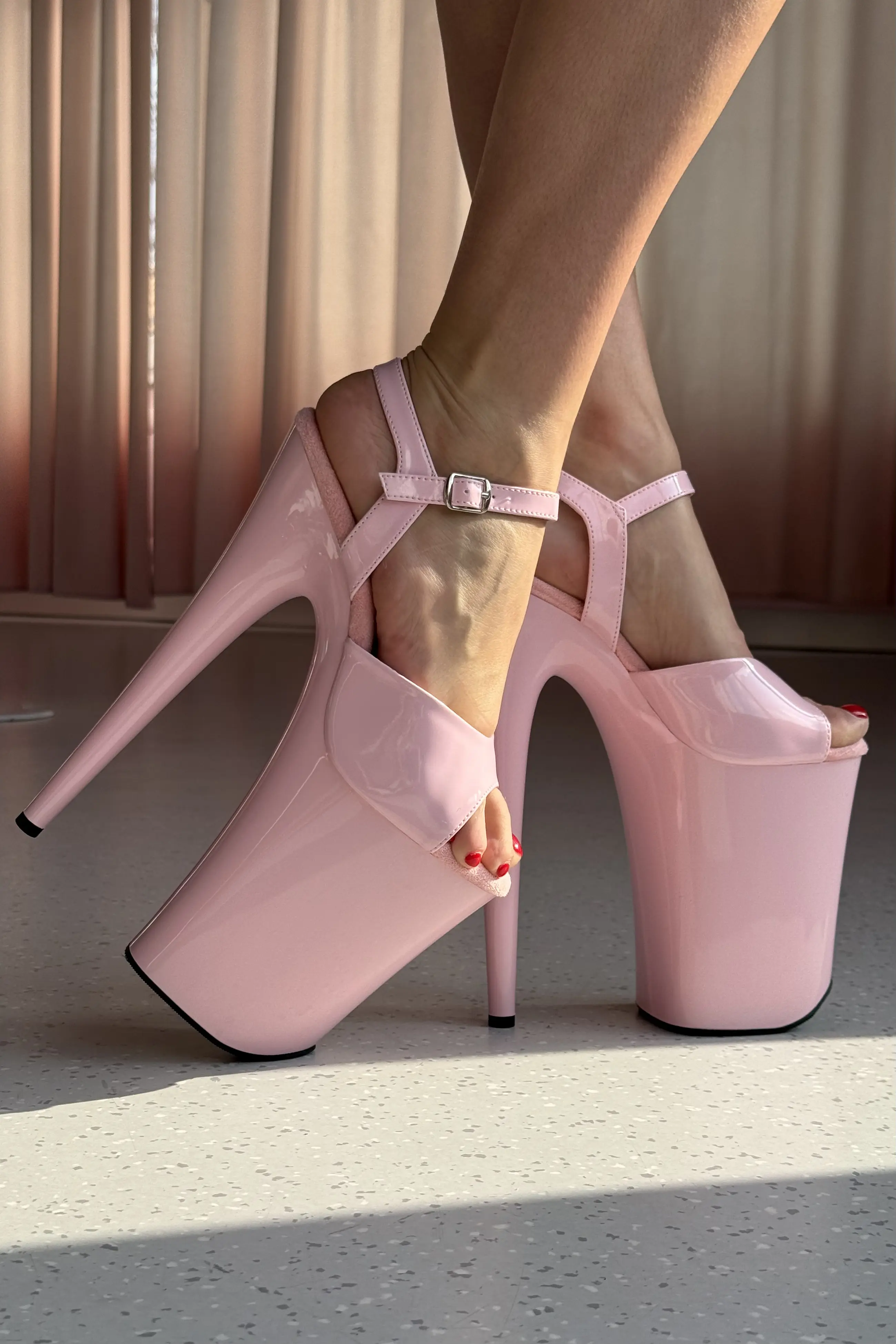 Zaszalej z wysokością i spróbuj 9 cali! Klasyczne sandałki do exotic pole dance, które polecamy jedynie zaawansowanym tancerkom ze względu na wyjątkową wysokość obcasa. Sandałki do tańca na rurze infinity mają wysokość obcasa aż 23 cm i 13,5 cm platformę. Paski i wierzch buta wykonane są z różowej eko-skóry, a platforma pomalowana została w tym samym kolorze. Sandałki do exotic wykonane z lakierowanego materiału są szersze niż te sylikonowe.