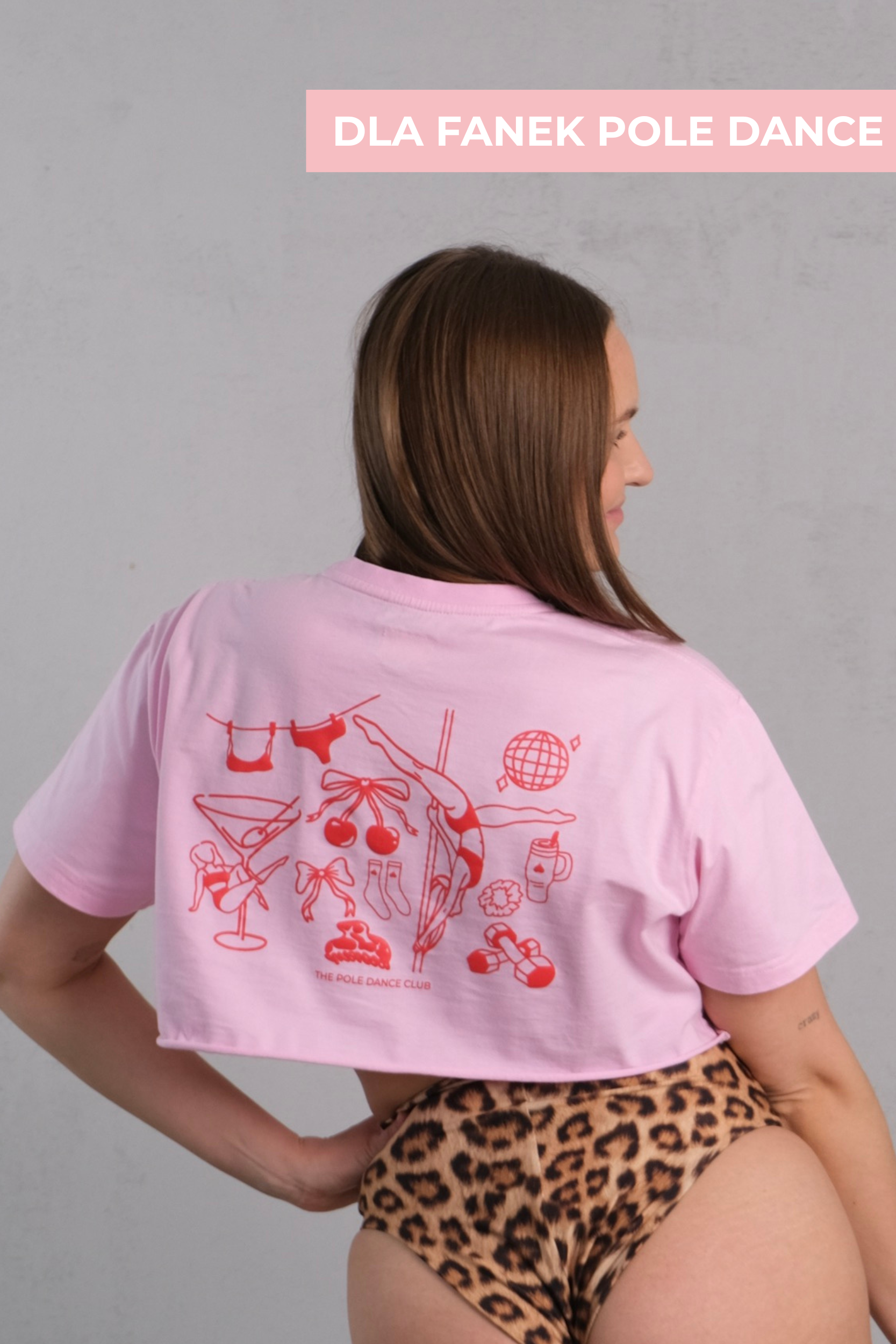 Różowy crop top o luźnym, oversize’owym kroju z krótkim rękawem, ozdobiony przyciągającymi uwagę grafikami inspirowanymi pole dance. Dynamiczny nadruk podkreśla energię i kobiecość, dodając całości wyrazistego, tanecznego charakteru.